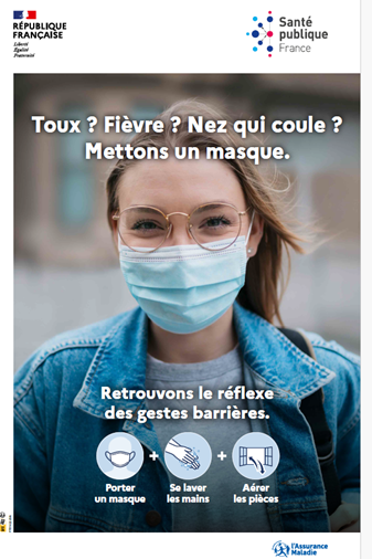 Dans le cadre de la prévention des infections respiratoires en période hivernale, le port du masque chirurgical est recommandé pour toute personne âgée de plus de 6 ans (professionnels, patients, intervenants extérieurs et visiteurs) dans l’ensemble des zones où circulent des patients (halls, ascenseurs, couloirs, salles d’attente, unités, etc.).
