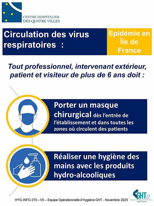 Dans le cadre de la prévention des infections respiratoires en période hivernale, le port du masque chirurgical est recommandé pour toute personne âgée de plus de 6 ans (professionnels, patients, intervenants extérieurs et visiteurs) dans l’ensemble des zones où circulent des patients (halls, ascenseurs, couloirs, salles d’attente, unités, etc.).